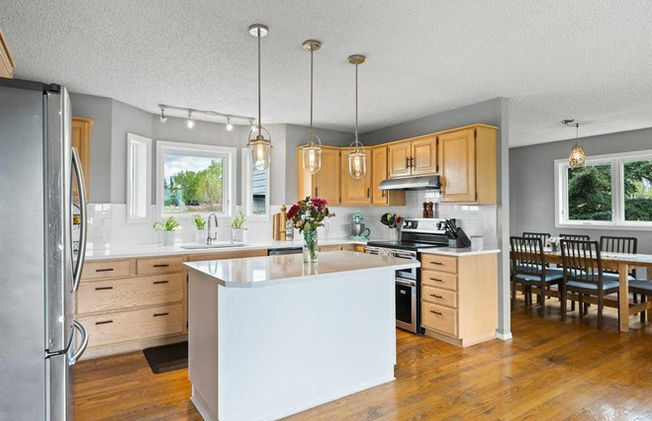 Featuring this bright, open concept bi-level. The kitchen is complete with a large island, stainless steel appliances and quartz countertops. Large living room with three 4'x6' bay windows from 2006. 2' x 6' walls. Primary bedroom equipped with an ensuite bathroom. Main floor laundry. Newer high end shingles, dual zone furnace & HVAC system, humidifier, hot water tank, water filtration system & updated lighting. The sunroom is to come off for transport. Built in 1990.
